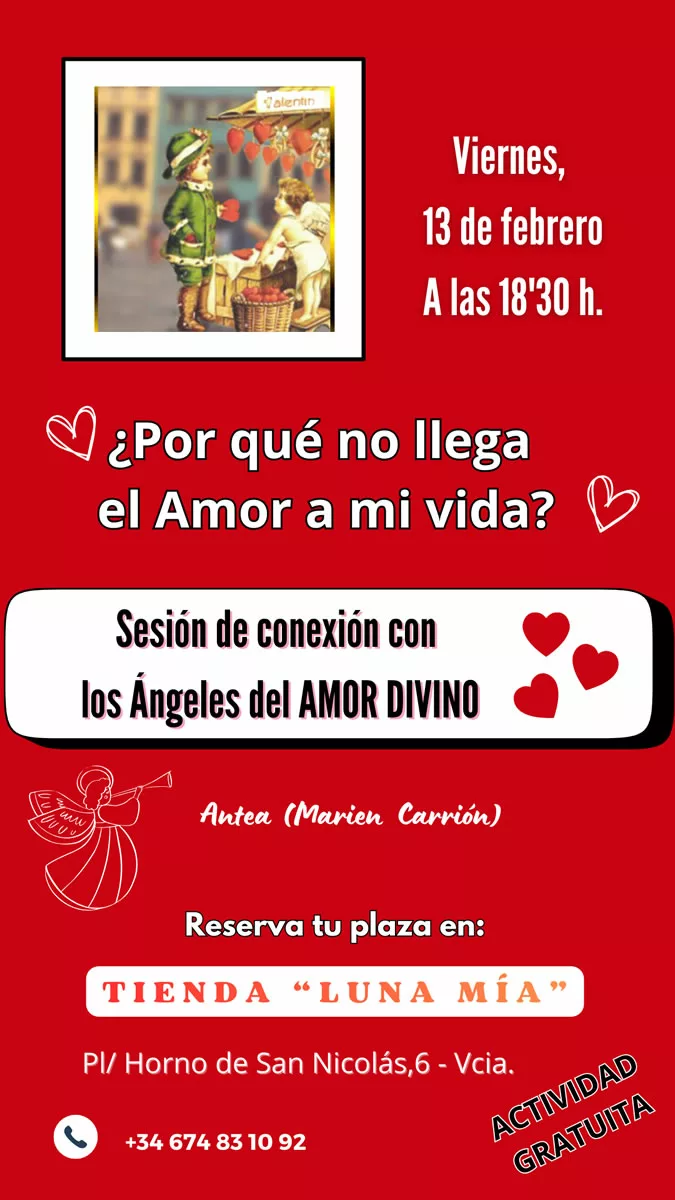 La víspera de San Valentín vamos a realizar una Sesión grupal GRATUITA, de conexión con los ÁNGELES DEL AMOR DIVINO, para ayudarnos a liberar los bloqueos internos que me impiden …
